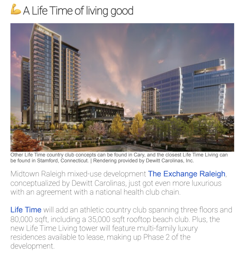 One such example is a recent public relations campaign for our client Dewitt Carolinas, who announced a planned Life Time and Life Time Living apartment residences and luxury athletic club for its highly anticipated Midtown development The Exchange Raleigh. First, we had to discern who the target audience was: Who did Dewitt Carolinas want to know this news and why?